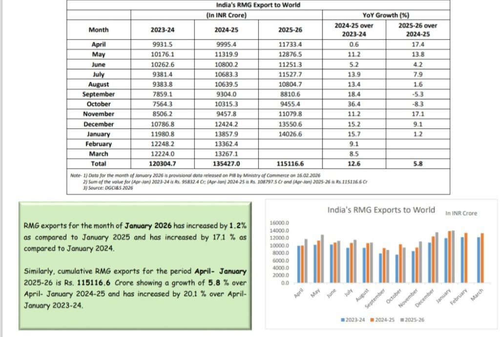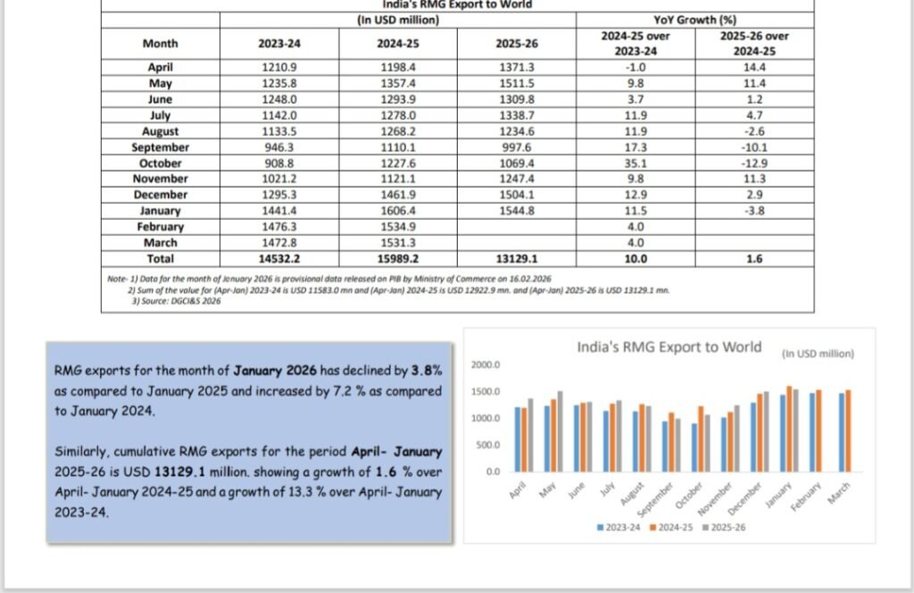 On a cumulative basis, India’s RMG exports during April–January 2025–26 reached USD 13,129.1 million. This represents a growth of 1.6% over the corresponding period of the previous year and a significant 13.3% increase compared to 2023–24.