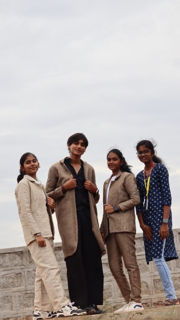 At NIFT-TEA College of Knitwear Fashion, Tirupur, creativity met sustainability when first-year B.Sc Apparel Fashion Designing students, Madhesh Karthik M., Hema G., Kaniskaa S., and Navina K., unveiled an inspiring collection crafted from upcycled rice sacks. Guided by Assistant Professor Mr G. Boopathy Vijay, the students transformed discarded materials into stylish garments that balance fashion with social responsibility.
